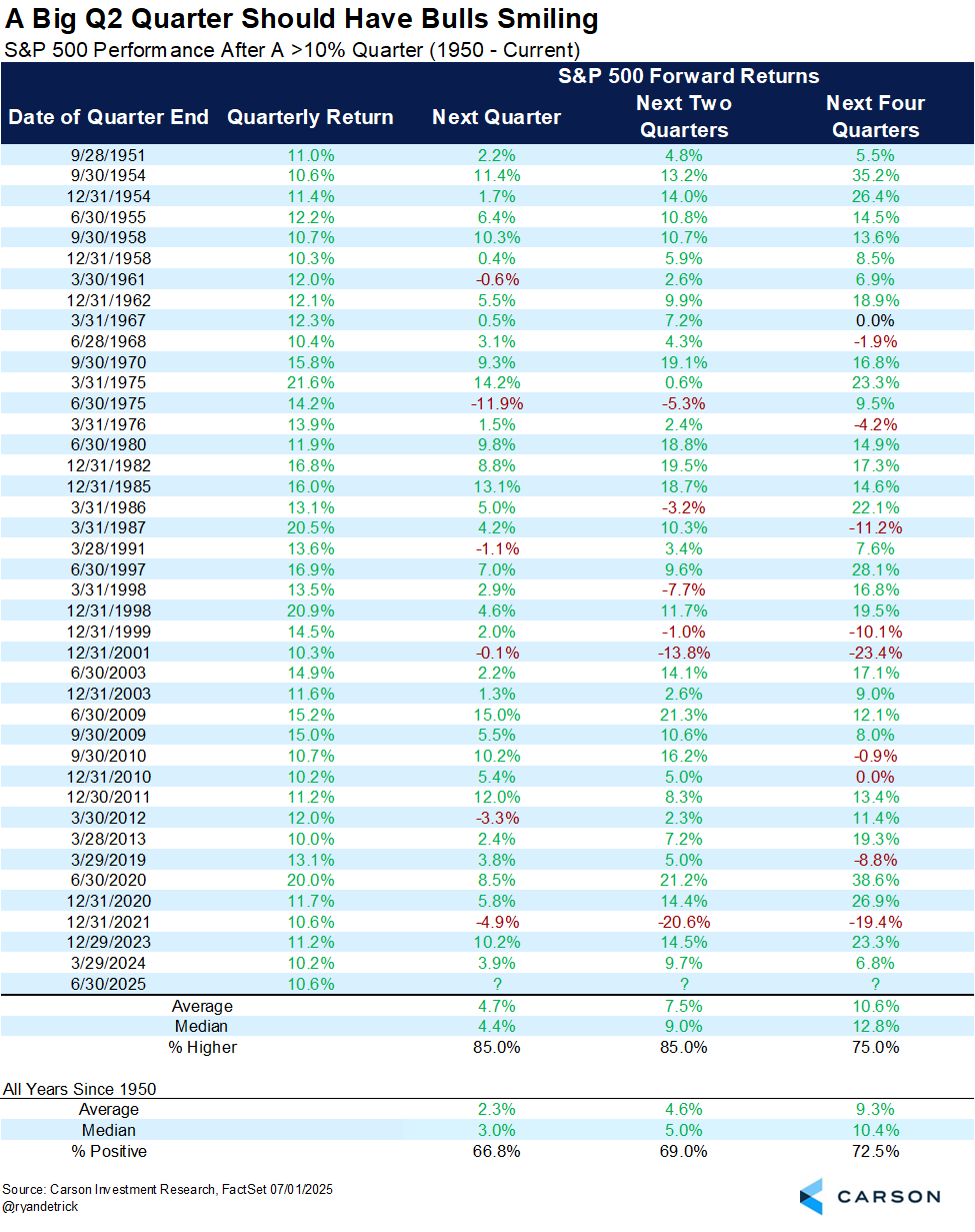 Another dataset: when the S&P 500 gains more than 10% in the second quarter, the rest of the year has been higher 85% of the time since 1950.