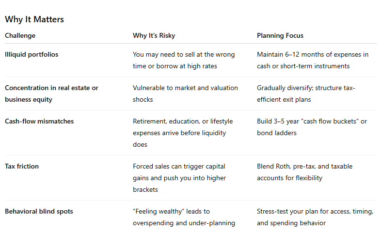 A portfolio of real estate, business ownership, and retirement funds may look diversified but offer zero flexibility. Balance with taxable accounts, brokerage assets, or credit lines that can bridge gaps.Stress-Test for “Access Risk”