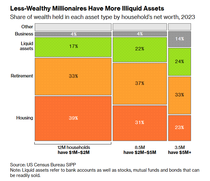 Less-wealthy millionaires hold most of their net worth in housing and retirement accounts, with far less in liquid, accessible assets.