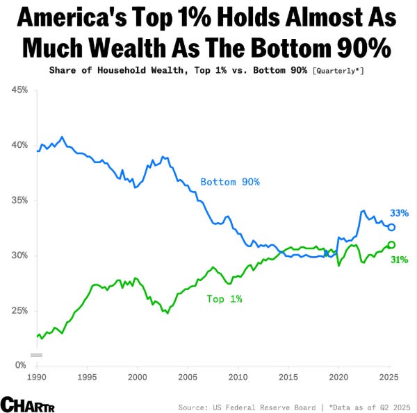 Over time, wealth has become increasingly concentrated in the hands of the top 1% — who now hold roughly 31% of total household wealth, nearly equal to what the bottom 90% collectively own.