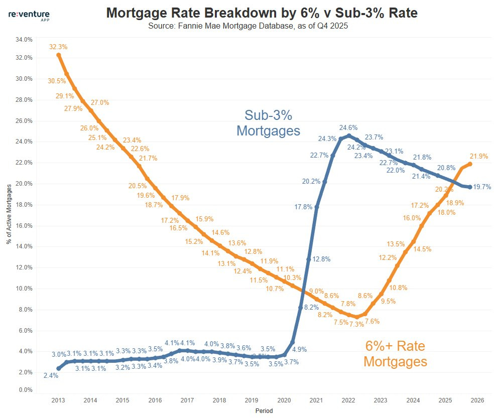 Blue line (Sub-3%) → Homeowners who locked in ultra-low rates during 2020–2021
