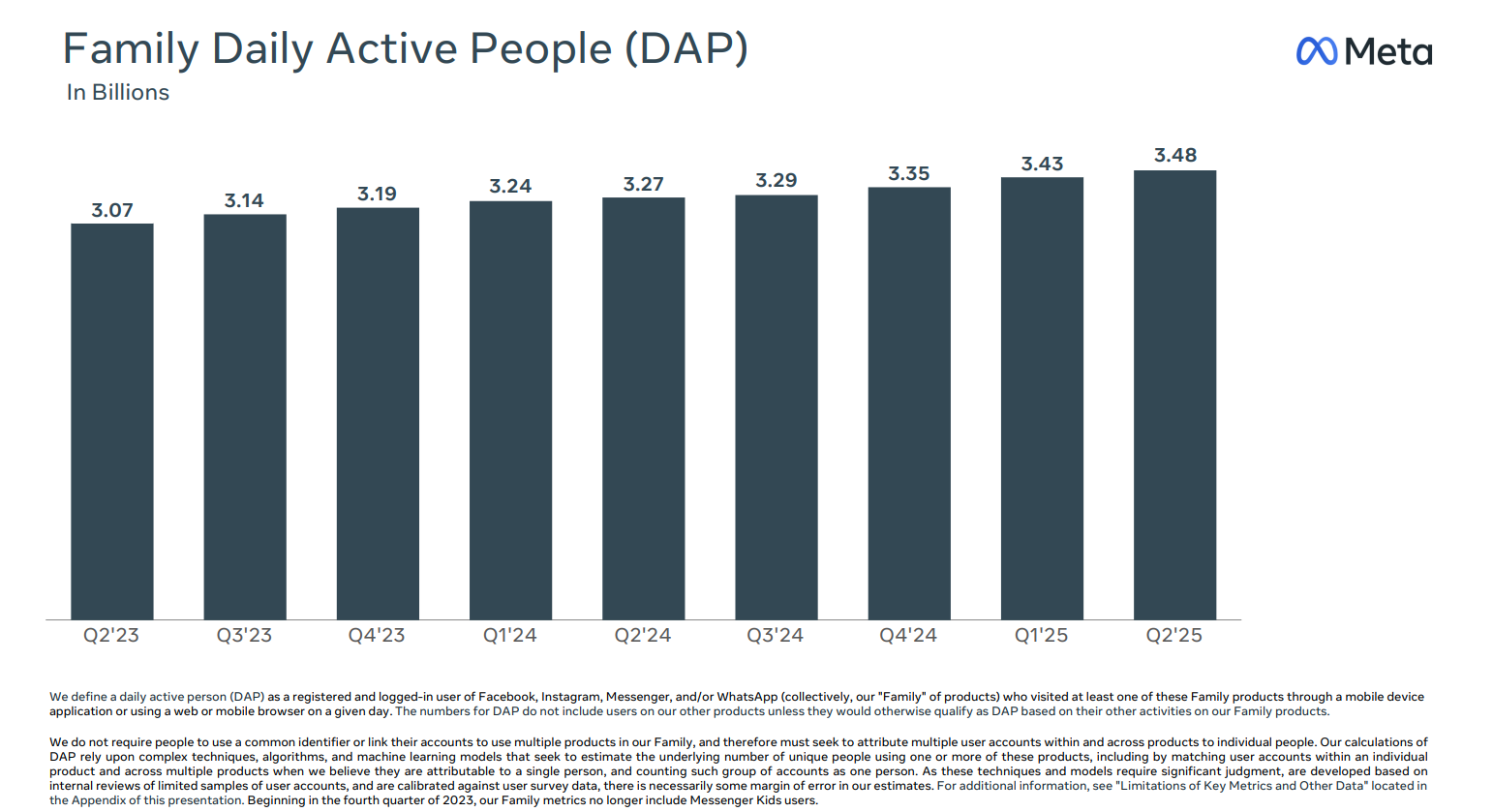 Meta (formerly Facebook) reported 3.48 billion active daily users in Q2 2025.
