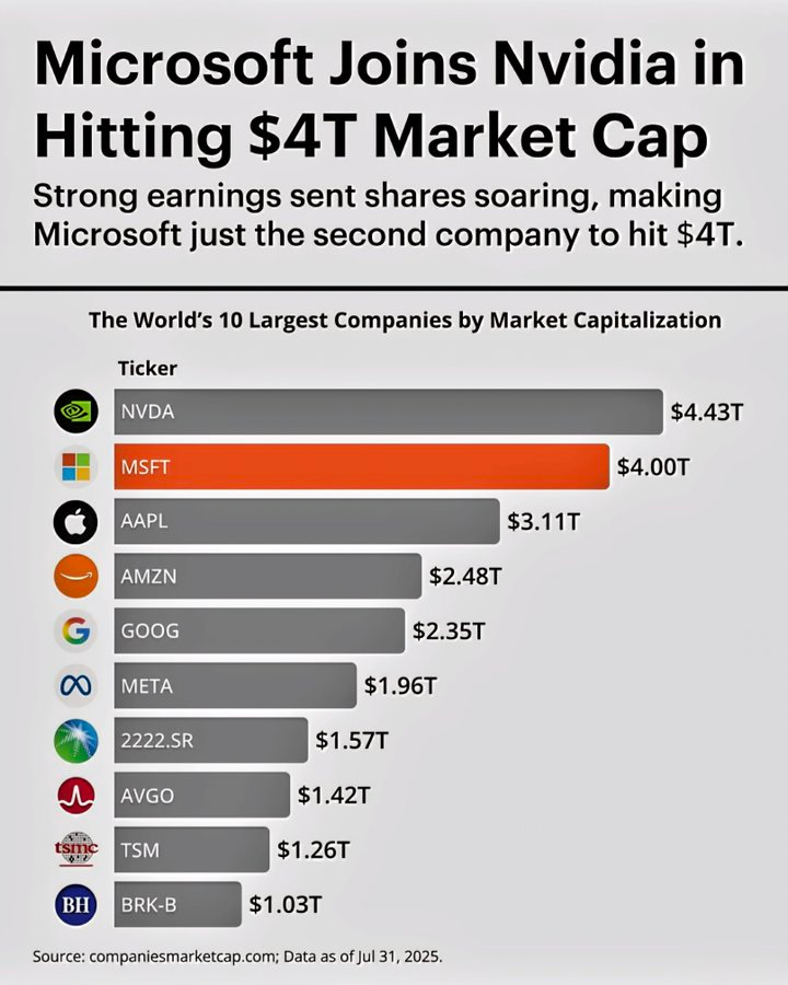 Not to be outshined by Meta’s impressive earnings last week, Microsoft also had strong earnings and joined the exclusive $4 Trillion club. Microsoft is the second most valuable company in the world and Meta jumped over $2 Trillion, making it the sixth largest company globally.